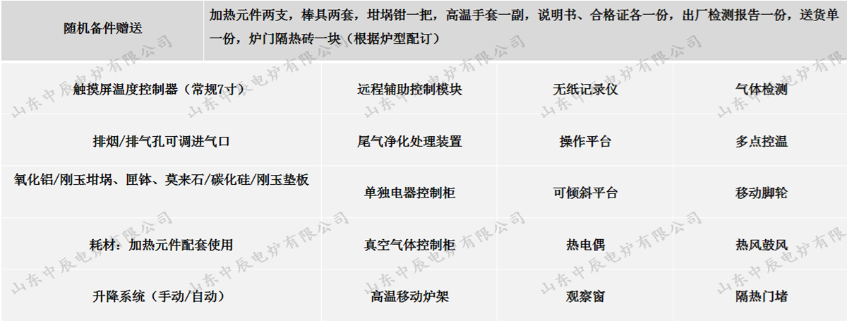 加熱元件兩支,棒具兩套,坩堝鉗一把,高溫手套一副,說明書、合格證各一份,出廠檢測報(bào)告一份,送貨單一份,爐門隔熱磚一塊(根據(jù)爐型配訂) |